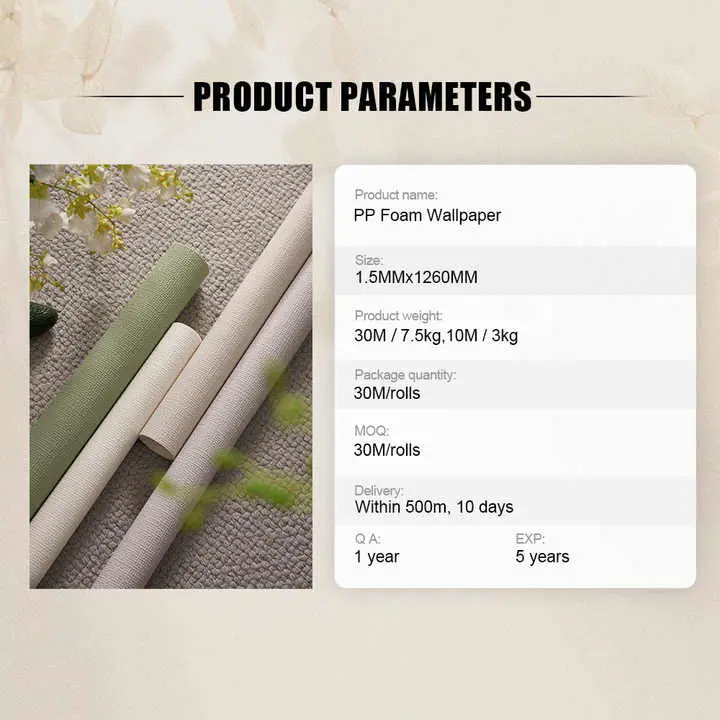 · বহু-কাৰ্য্যকৰী সুবিধা: এই ৱালপেপাৰে এণ্টি-ষ্টেটিক বৈশিষ্ট্য, তাপ নিৰোধক, আৰু ১ বছৰৰ ৱাৰেণ্টীকে ধৰি বহুতো সুবিধা প্ৰদান কৰে, যিয়ে ব্যৱহাৰকাৰীসকলক মানসিক শান্তি আৰু তেওঁলোকৰ অভ্যন্তৰীণ ডিজাইনৰ প্ৰয়োজনীয়তাৰ বাবে এটা দীৰ্ঘস্থায়ী সমাধান প্ৰদান কৰে।